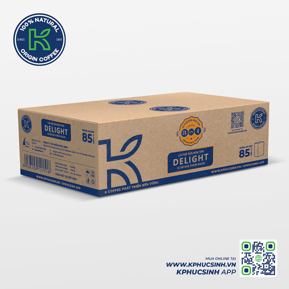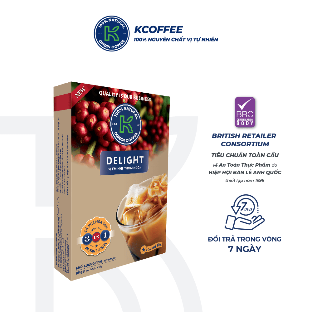 Cà phê sữa hòa tan KCoffee Delight 3in1 được làm từ nguồn nguyên liệu chất lượng với những hạt cà phê sạch, thuần khiết phối hợp hoàn hảo cùng đường sữa đem đến một hương vị ngọt ngào, thơm béo hòa quyện cùng vị đắng đặc trưng giúp đánh thức vị giác, khơi dậy hứng khởi cho ngày làm việc tỉnh táo, tràn đầy năng lượng.