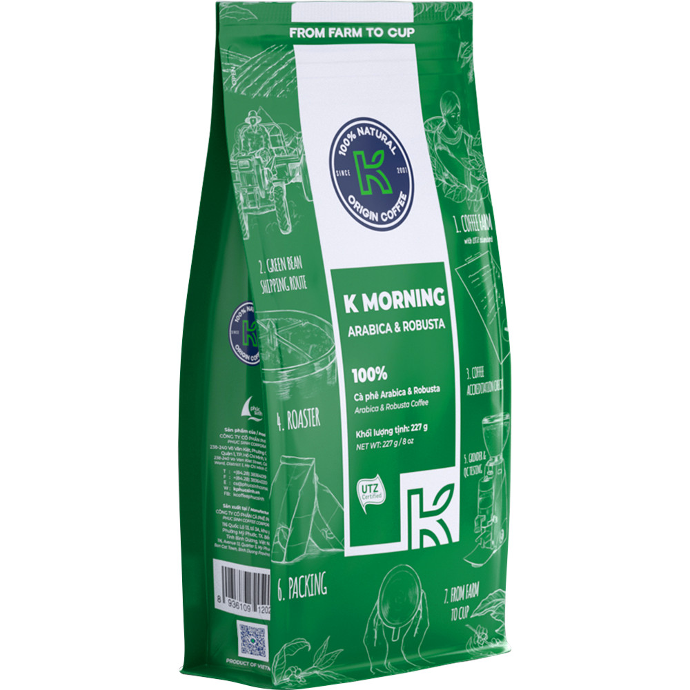 Cà phê rang xay K Morning là sự kết hợp tinh tế của 100% hạt Robusta và hạt Arabica mang đến vị đậm đà, hậu vị kéo dài ở cuống họng. Dành cho những người có gu đậm vừa, phong cách cà phê Việt Nam