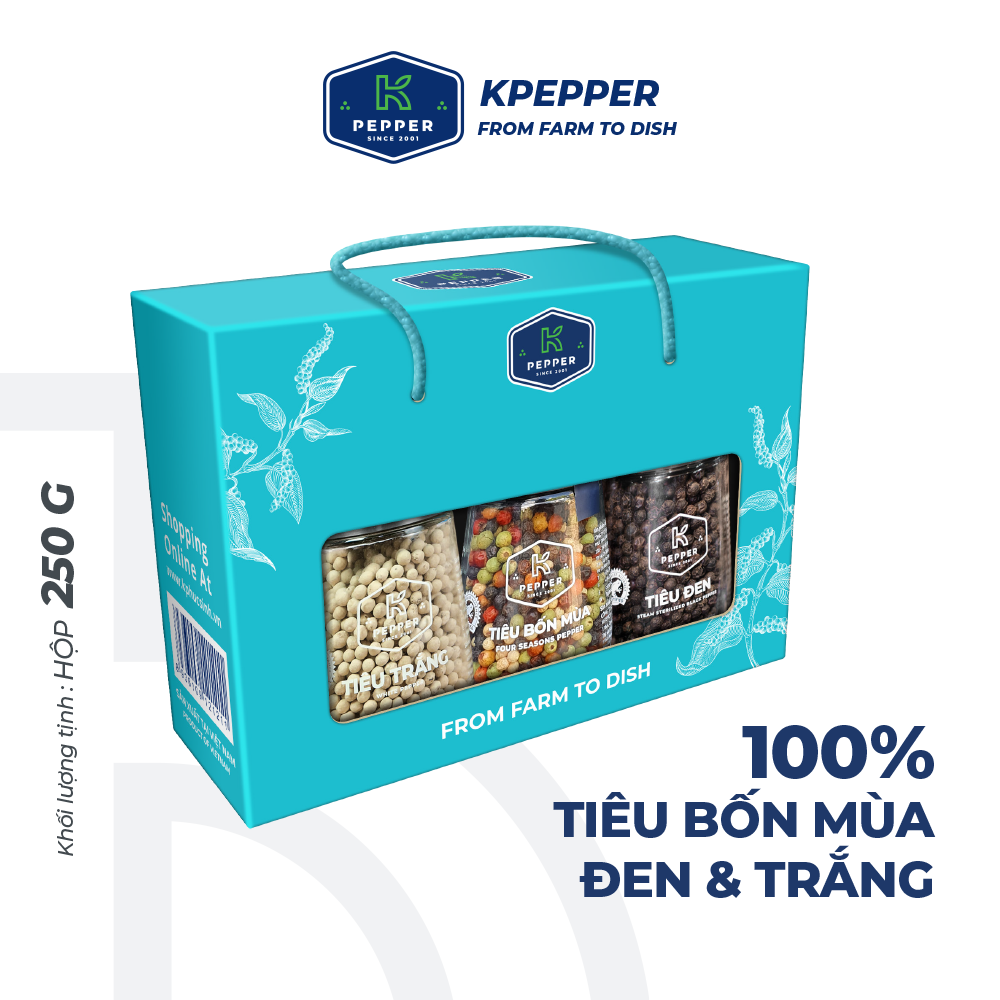 √ Tiêu Bốn Mùa: Được kết hợp bởi 4 dòng Tiêu đen, Tiêu trắng, Tiêu xanh & Tiêu hồng sấy lạnh. Thơm ngon, lạ mắt, tạo lên 1 vị tiêu hòa quyện đầy mê hoặc.