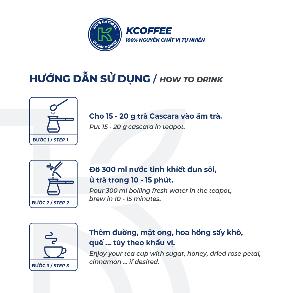 Cách pha & thưởng thức trà Cascara Blue Sơn La cũng đơn giản như cách pha trà thông thường. Dù uống nóng hay uống đá với chanh, cam, đào, hoa hồng, vải.