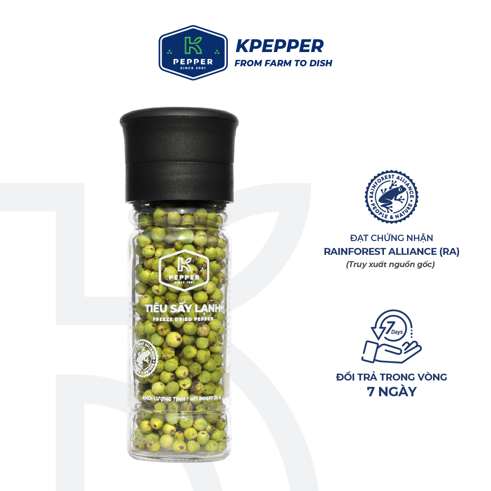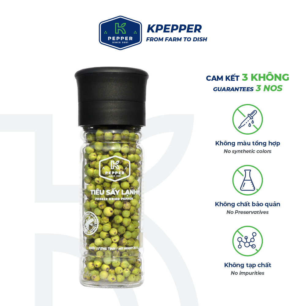 Tiêu xanh sấy lạnh được sản xuất theo công nghệ hiện đại của Đức. Những hạt tiêu xanh ngon nhất sau khi thu hoạch và chọn lọc tại vườn sẽ được xử lý và chế biến trong vòng 2 giờ theo quy trình sấy lạnh để giữ nguyên màu sắc tươi xanh, đảm bảo độ nồng cay và ngọt nhẹ. Tiêu xanh sấy lạnh K Pepper không thể thiếu cho nhiều món ăn & ẩm thực Á - Âu.